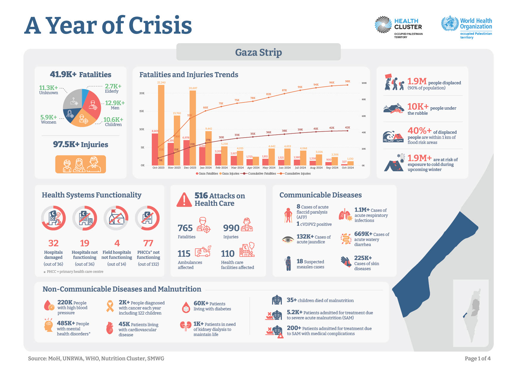 Since October 2023, Gaza has experienced unprecedented destruction, leaving its healthcare system in total collapse. Hospitals are non-functional, and medical supplies are severely depleted. About 1.6 million Palestinians rely on UNRWA health services, which struggle to operate amid fuel and supply shortages. The lack of sanitation and clean water has driven a surge in diseases, including acute malnutrition affecting one in ten children. Mental health conditions, such as PTSD and severe anxiety, are widespread due to continued violence. Without urgent interventions, the humanitarian crisis in Gaza will worsen, further endangering the lives of millions.[1]